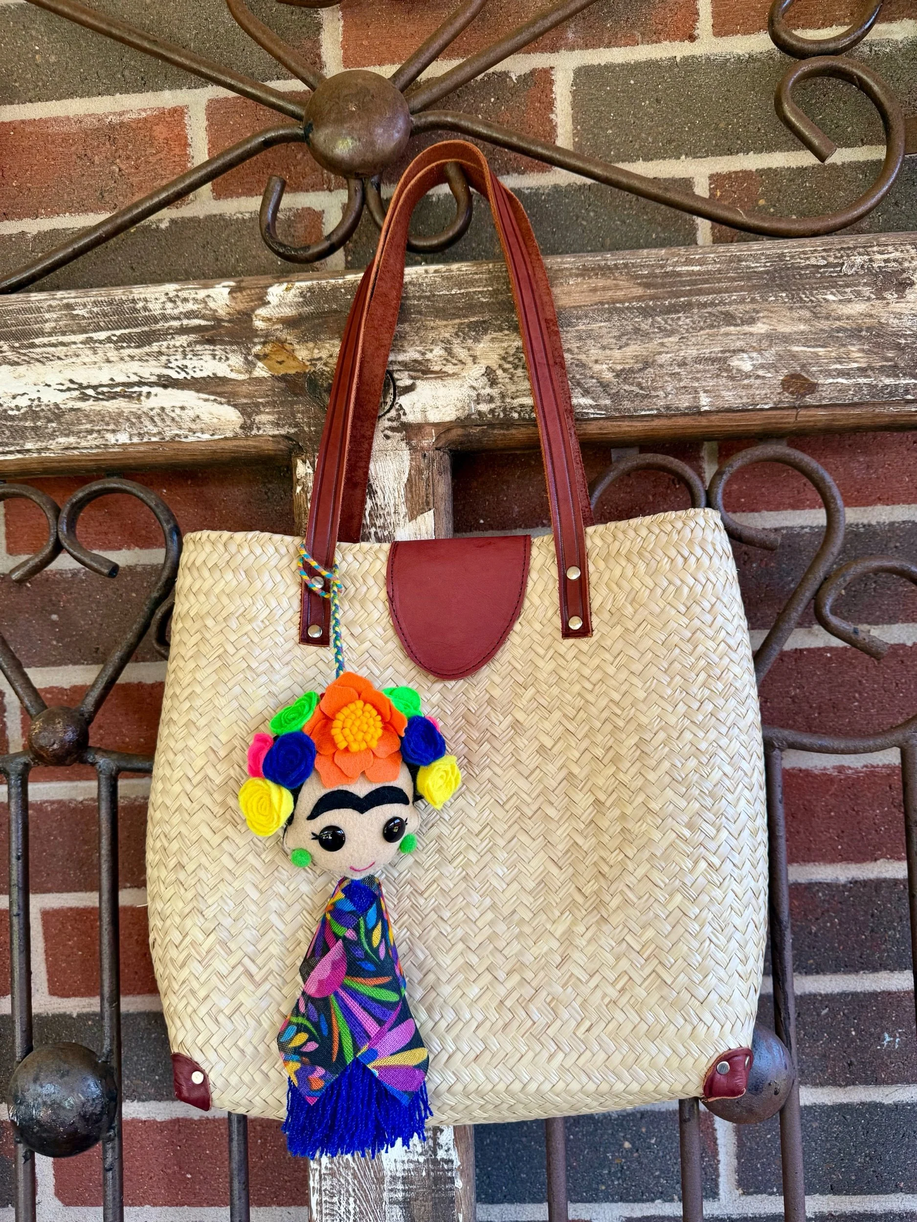 A unique and beautiful eco-friendly natural tone Palm material woven bag design makes this handbag a piece of art. The bag has a leather strap and a bag clasp. 9x5 in handmade Frida tassel.